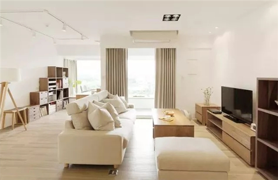 实木茶几和米色布艺沙发相结合,彰显了日式简约淡雅、朴素、节制、宁静的自然风格,营造出深邃禅意与闲适写意的生活境界。
