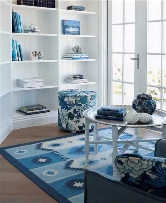 同色系相结合,仿佛置身于地中海之中。花纹地毯的合理运用也可以打造出一块蓝色的读书角落。